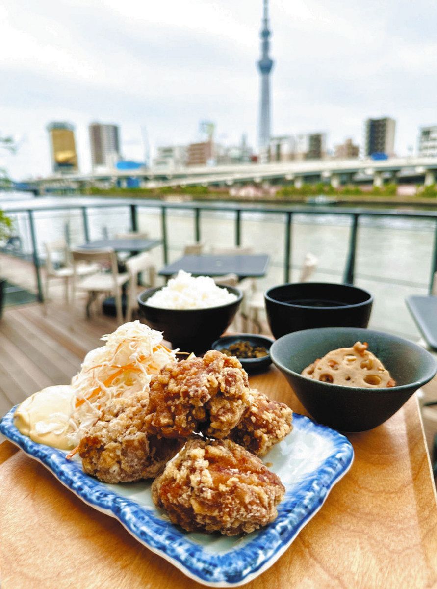 見下ろせば東京・下町の隅田川。対岸にスカイツリーを望める。堤防に張り出した2階のテラスは、京都・鴨川の光景になぞらえて「川床」と称している。