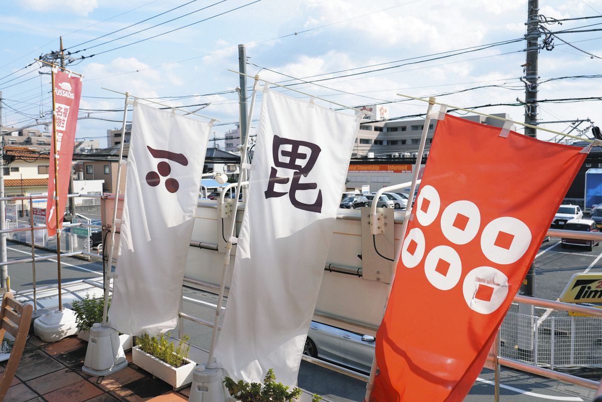 テラス席に戦国武将ののぼりがはためく=福生市で
