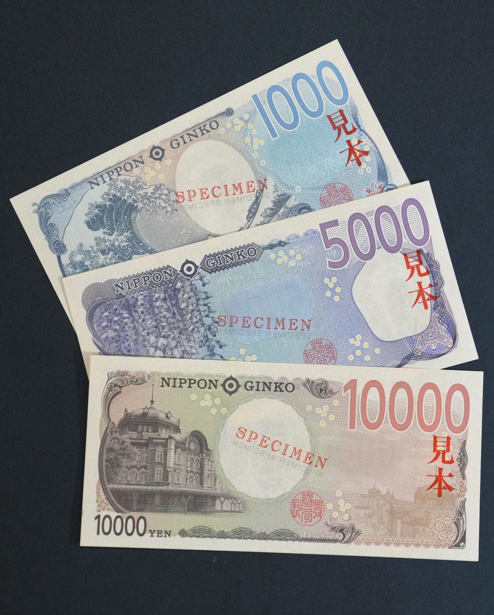 新しく発行される(上から)1万円、5000円、1000円の紙幣サンプル
