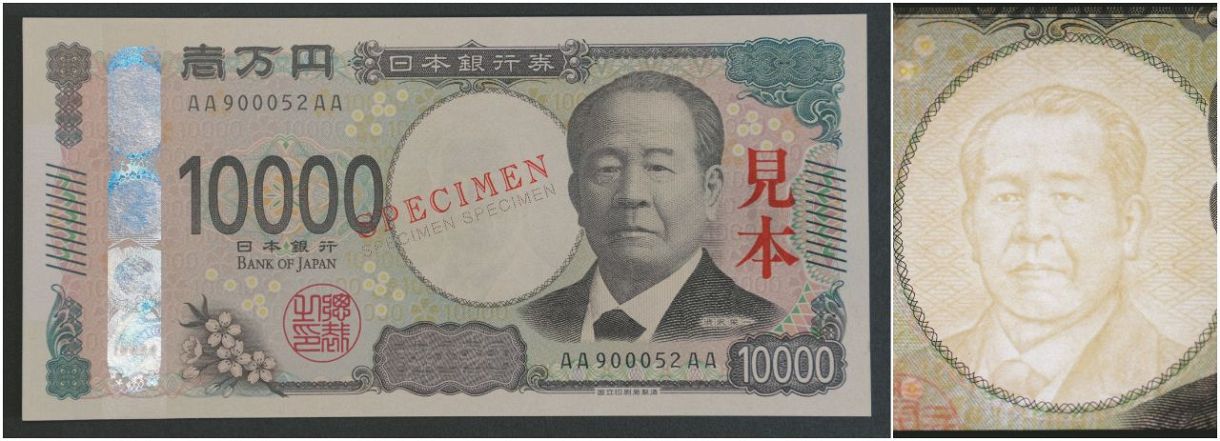 1万円の新紙幣サンプル(表)。右は透かしで見ることができる肖像