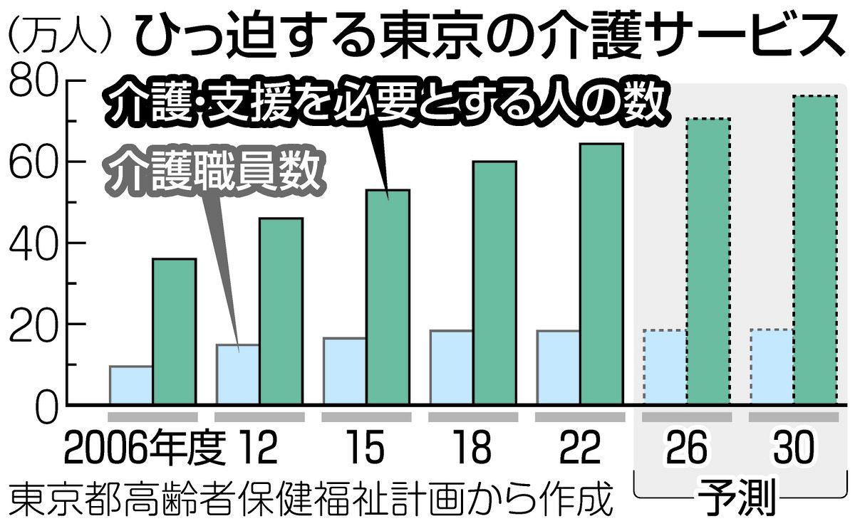 都は介護職員に月最大2万円の特別手当を支給するなど待遇改善に取り組むが、高齢者が増えるスピードに介護職員の確保が追いついていないのが実情だ。