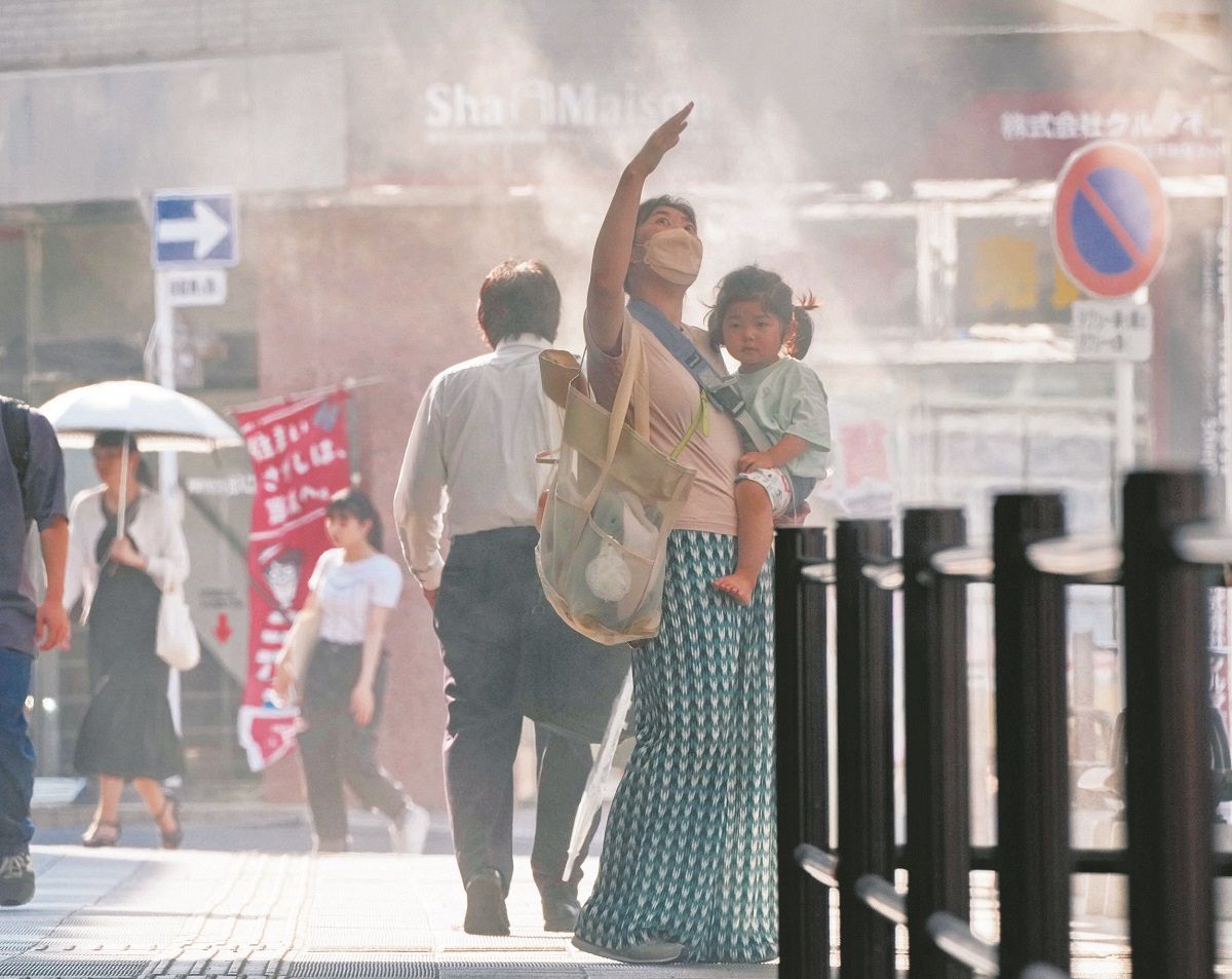 JR熊谷駅前のミストで涼む親子連れ=5日16時13分、埼玉県熊谷市で(木戸佑撮影)