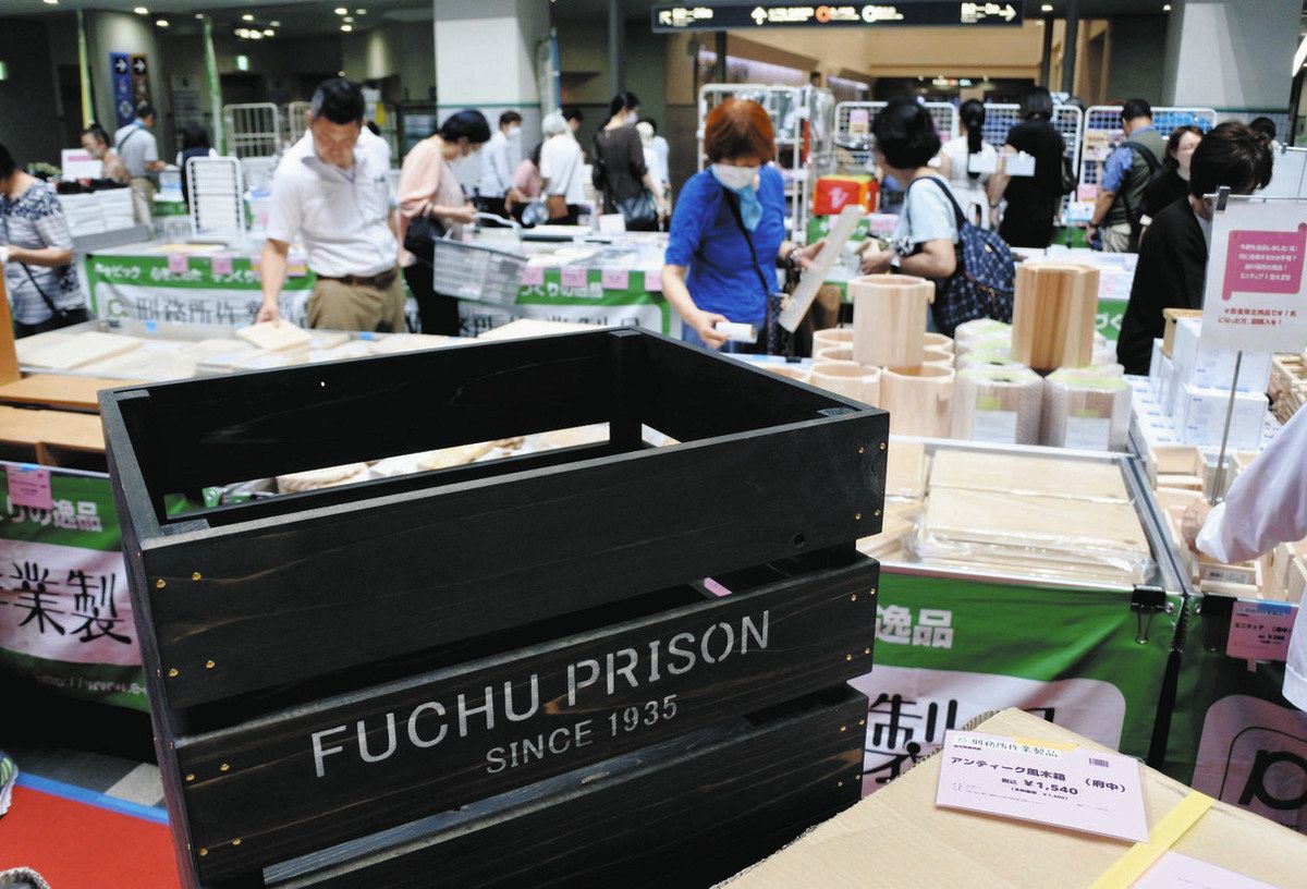 英語で「府中刑務所」と書かれた木箱(手前)など刑務所の製品が並ぶ会場=文京区で