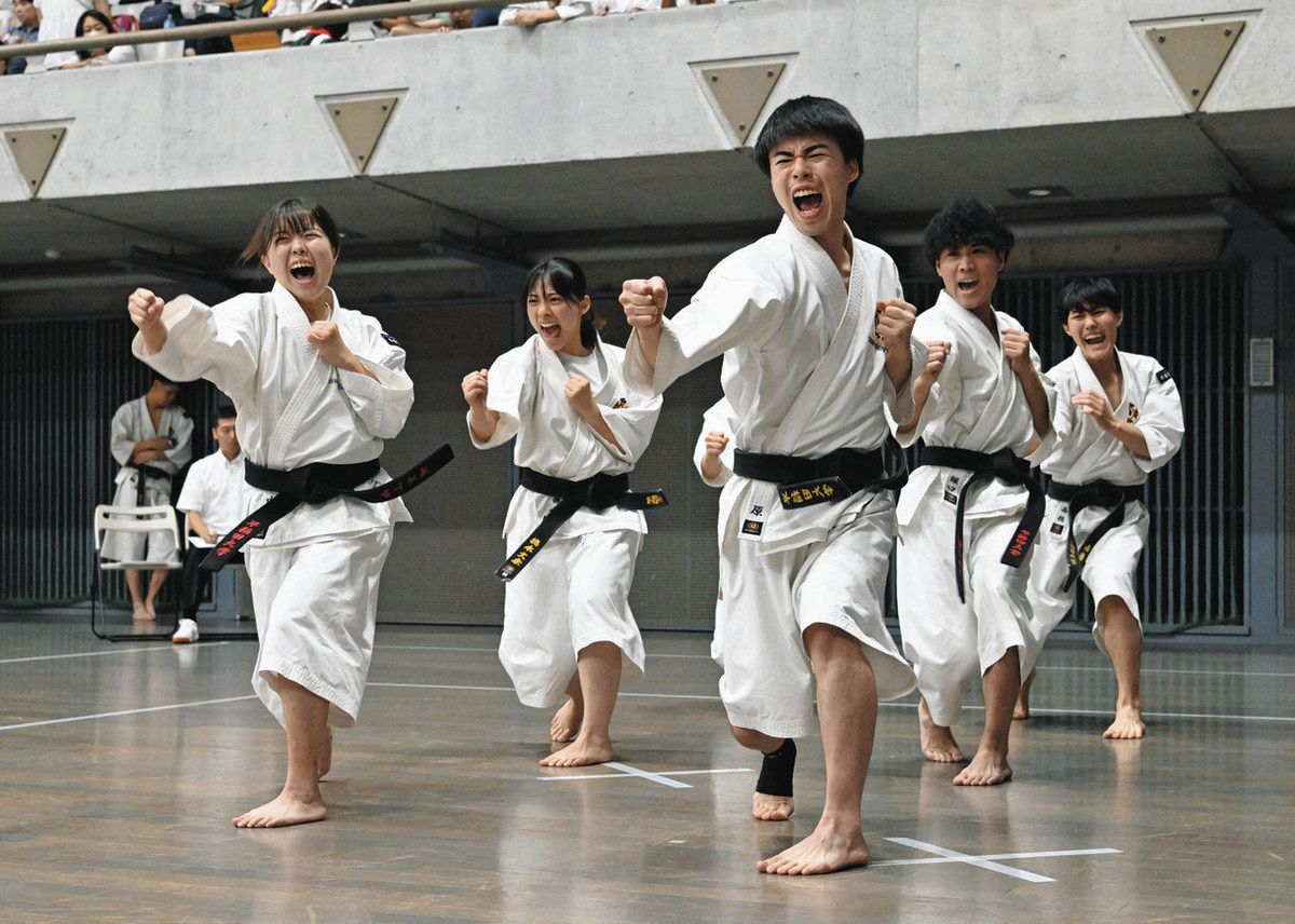 団体の部で技を披露する早稲田大の拳士たち=いずれも足立区の東京武道館で