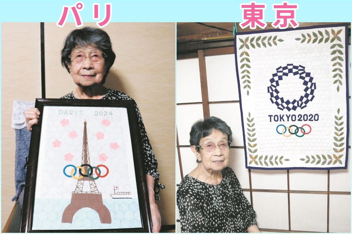 東京都北区在住の石川和枝さん(96)が、熱戦が続く2024年パリ五輪をイメージしたパッチワーク作品を完成させた。21年の東京五輪に続いて、スポーツの祭典をテーマにした。今回は、2年以上続くロシアのウクライナ侵攻など戦争のニュースに心を痛め、平和への願いを込めて一針一針手縫いした。(細川暁子)