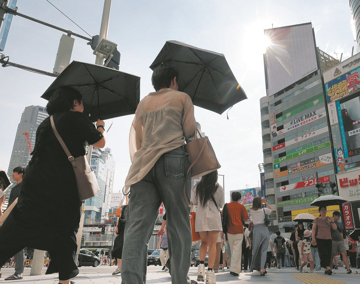 厳しい暑さの中、東京・渋谷を行き交う人たち=東京都渋谷区で(佐藤哲紀撮影)