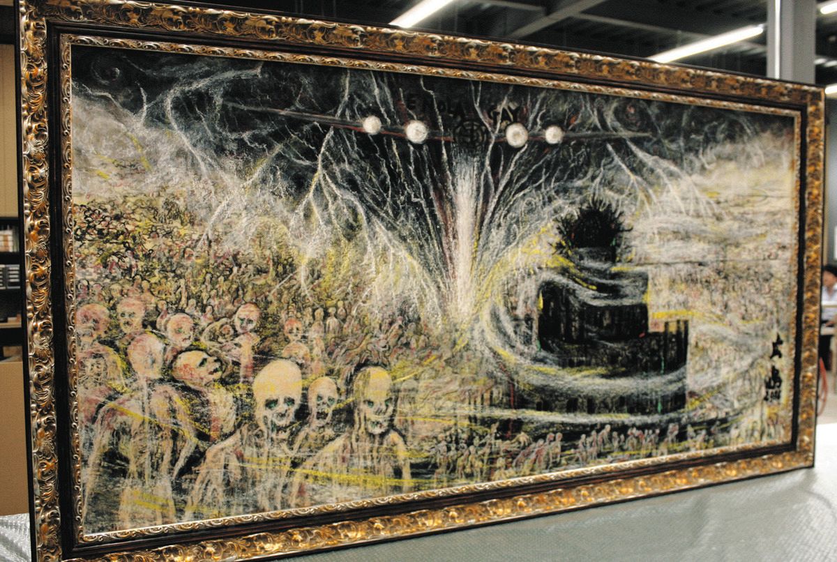 3カ月がかりで完成させた縦1メートル、横2メートルの作品『広島』は、原爆が投下された広島の惨状を木炭とオイルパステルで表現している。黒い空を米軍の爆撃機が飛び、稲妻のような光線が走る。原爆ドームの周囲を逃げ惑う無数の人々は、体が溶けて骨や臓器がむき出しになり、骸骨のようにも見える。