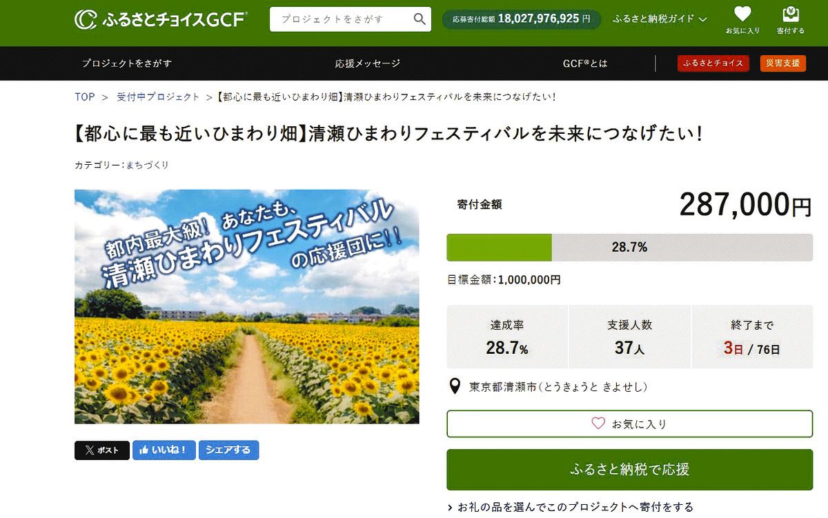 市は高騰する開催費用を補おうと昨年に続き、ふるさと納税サイト「ふるさとチョイス」の自治体向けクラウドファンディングのページに「都心に最も近いひまわり畑清瀬ひまわりフェスティバルを未来につなげたい!」を掲載。目標額は100万円で15日まで寄付を募っているが、13日夕現在、寄付額は昨年実績の55%の約29万円にとどまっている。