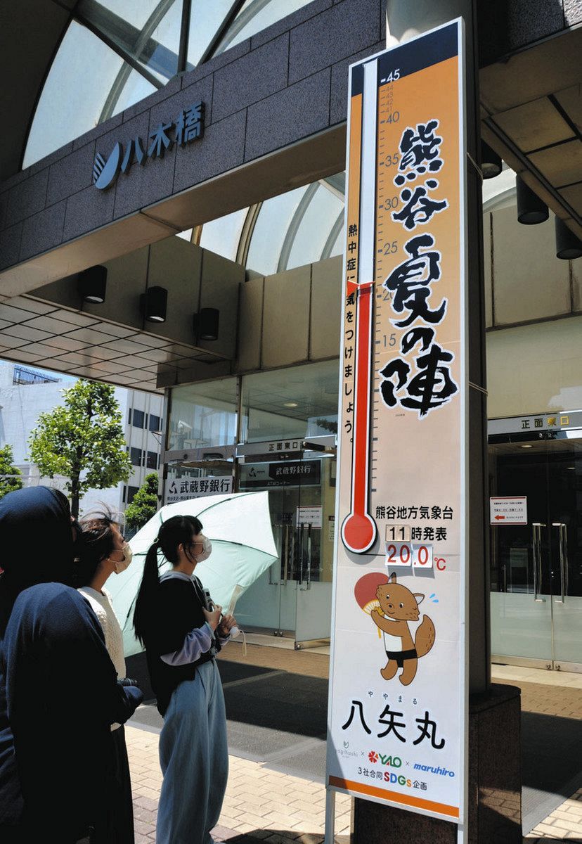 暑さで知られる埼玉県熊谷市の中心街に掲げられた大温度計=5月12日
