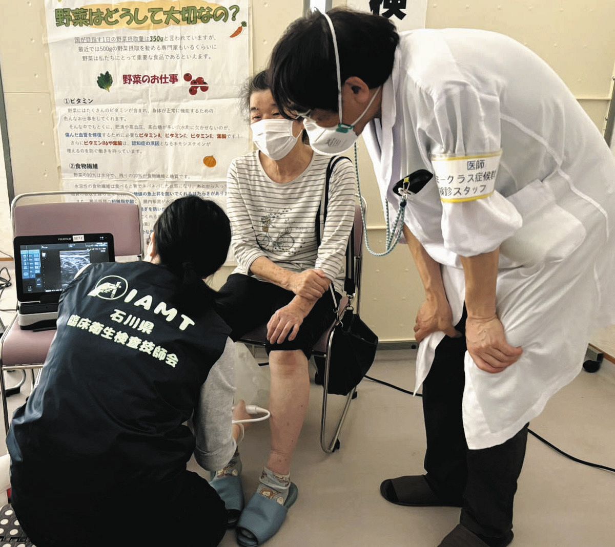 エコー検査で、受診者の脚に血栓がないかを調べる榛沢和彦医師(右)ら=石川県穴水町で