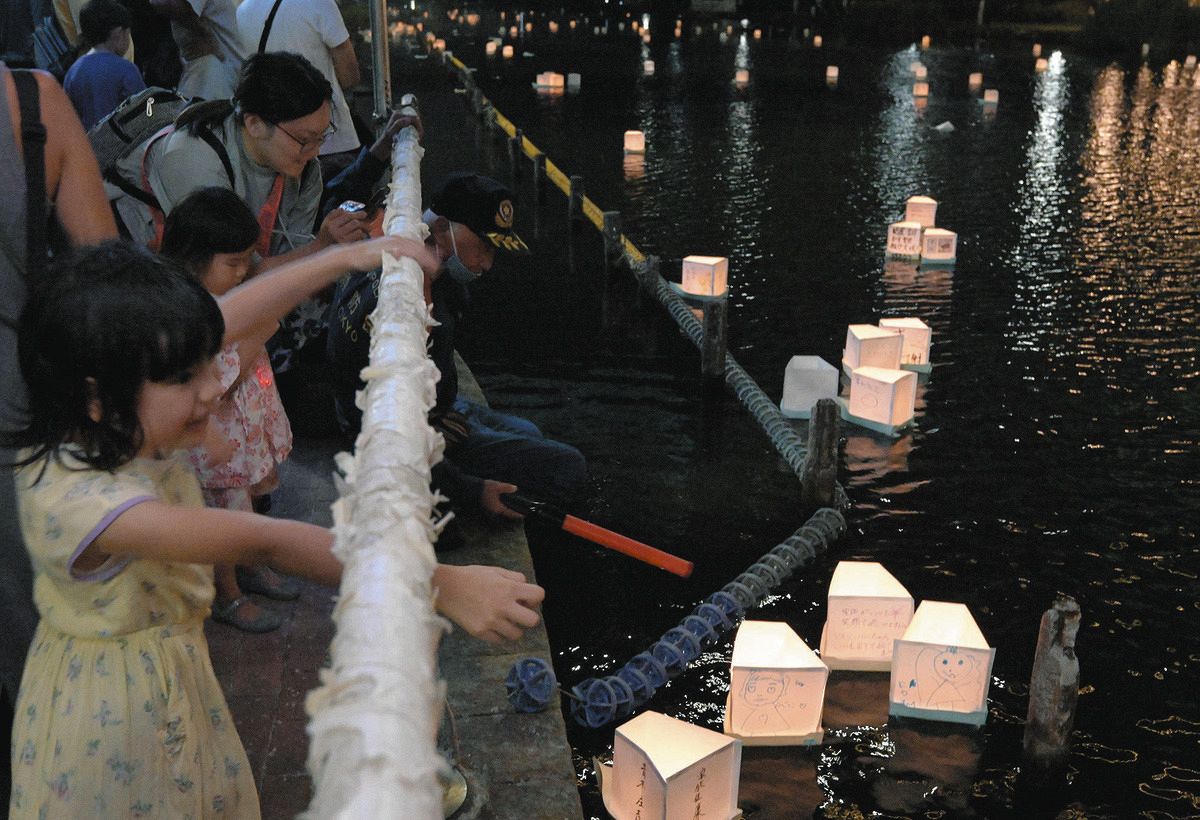 橋の上で式典があり、実行委の岸稲尾(いねお)委員長が「本当に戦争ほど悲惨で残酷なものはない。二度と戦争が起きない世界を次世代に引き継ぎたい」とあいさつ。両岸で参加者らが灯籠を川に流した。(鈴木里奈)