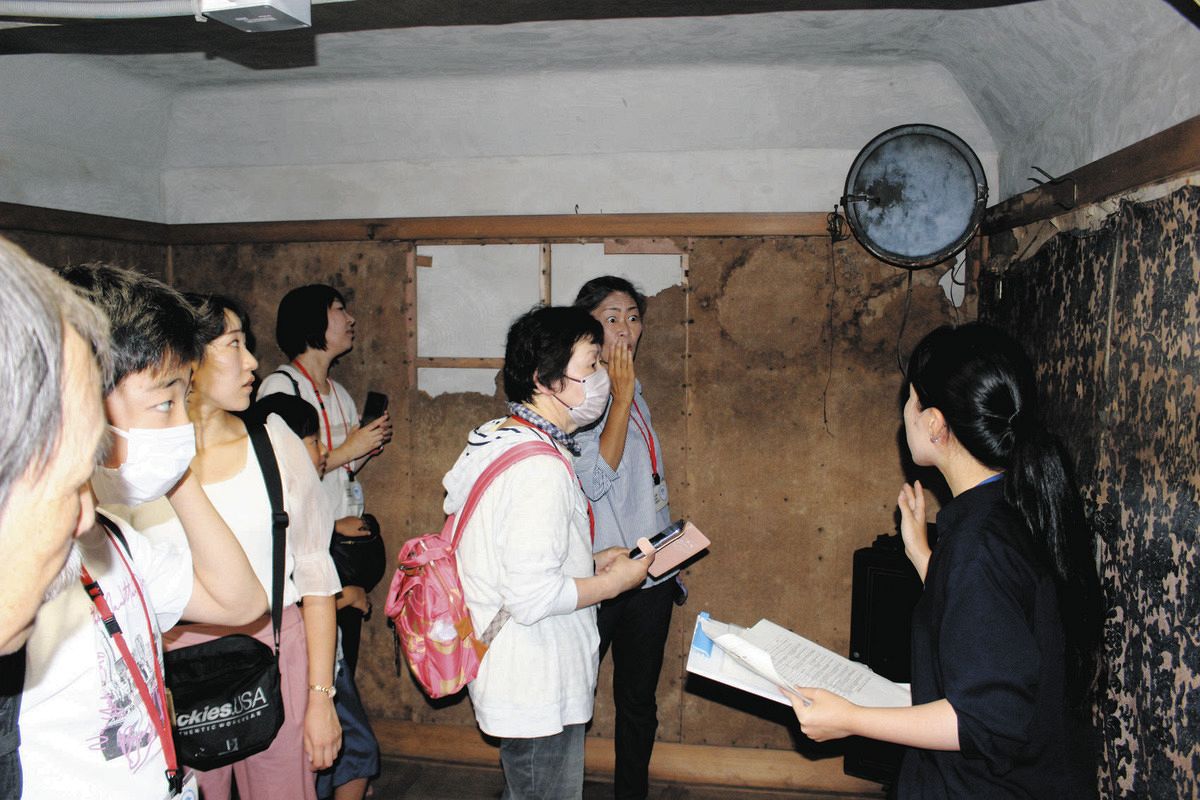 葛飾区柴又の区有形文化財「山本亭」の地下に残る防空壕(ぼうくうごう)の見学会が15日あり、参加者85人が戦時下の暮らしに思いをはせた。