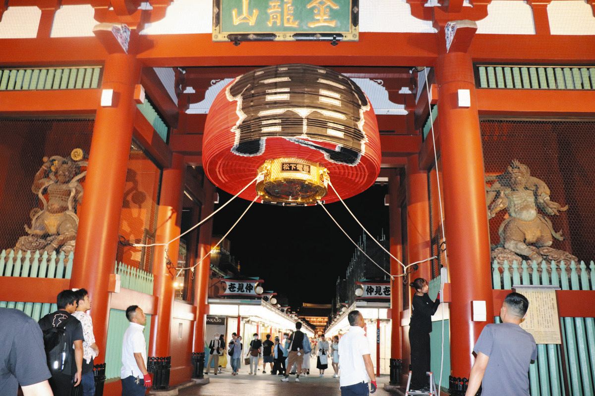 暴風雨による被害を防ぐ目的で、畳まれたのは雷門のほか宝蔵門、本堂の大提灯。午後7時半ごろから、修繕などを請け負う出入り業者の職人3人が下からロープを引っ張って折り畳んだ。雷門の大提灯は高さ3.9メートル、幅3.3メートル、重さ700キロ。
