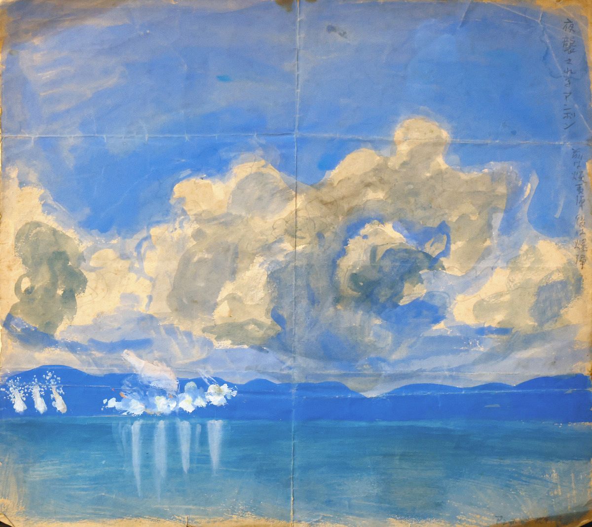 「夜襲されるアンボン。月明の夜のなぐり描き。眞暗の中でとにかく絵之具で描きました」。海の向こうに見える炎や煙。インドネシアの船上から空襲の様子を描いたとみられる絵の裏には、緊迫した様子が記されていた。