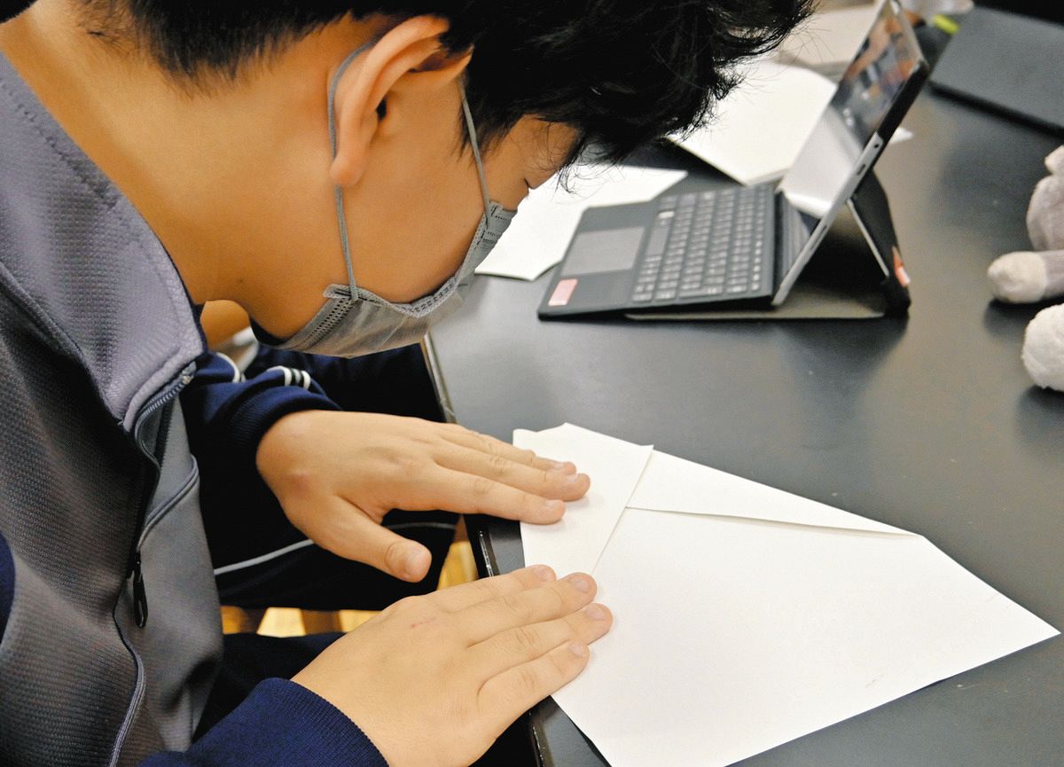 空気抵抗について調べるためにさまざまな形の紙飛行機を作る生徒