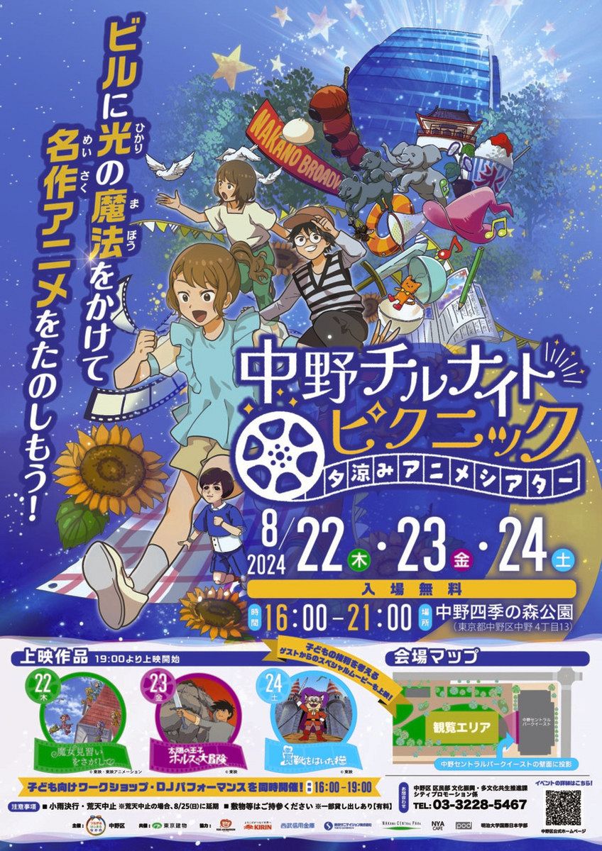 オフィスビル壁面を巨大スクリーンに見立ててアニメ映画の上映を行うイベント「中野チルナイトピクニック」が22~24日、東京都中野区中野4の中野四季の森公園で開かれる。上映は午後7時から。入場無料。