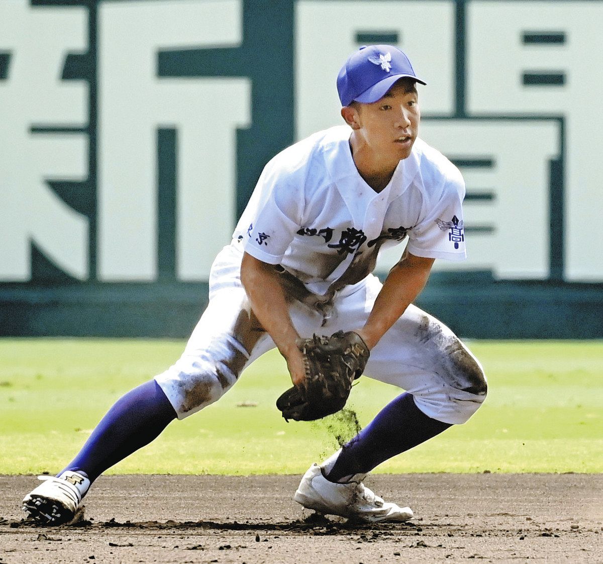 7回裏明徳義塾1死一、二塁、打者長谷川選手の二ゴロを好捕する小島選手