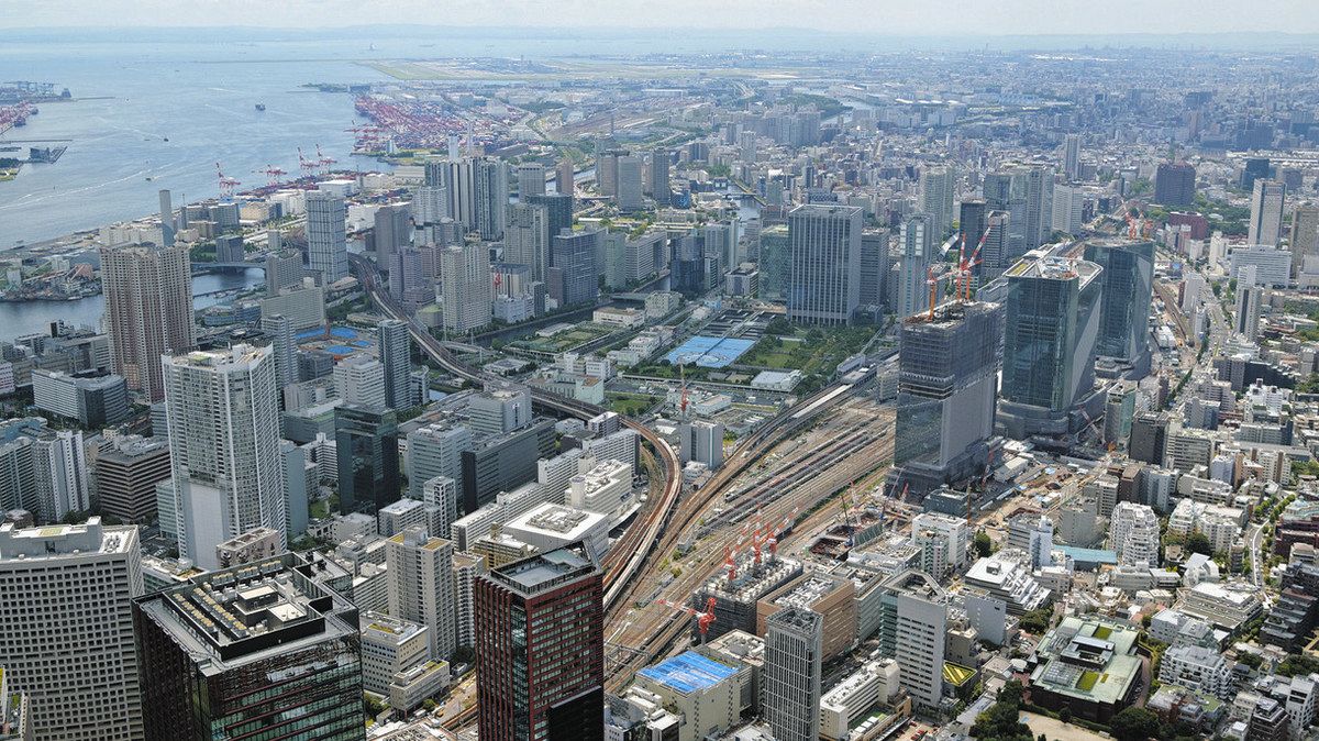品川駅、田町駅周辺。東京都は、再開発の折に「風の道」を確保するよう事業者に求めている=東京都港区で、本社ヘリ「あさづる」から
