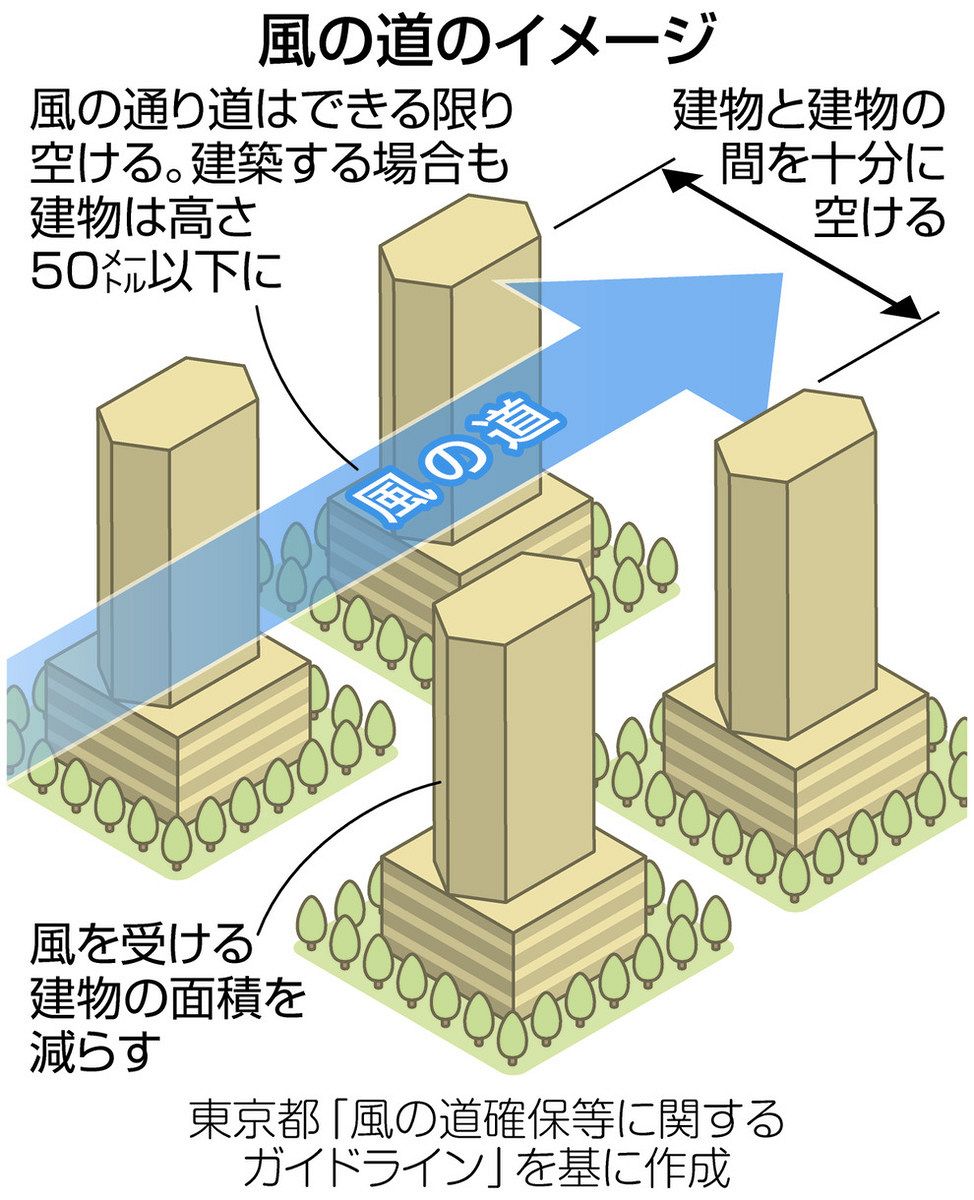 都が2020年に公表した指針では、地上50メートルで風速毎秒4メートル以上の海風の流れを「風の道」と設定。開発前の風速の50%以上を確保するため、できる限り新たな建物の高さを50メートル以下にしたり、建物と建物の間隔を空けたりするなどの対策を促している。事業者は開発前に気流シミュレーションを行い、風の道の確保策を都に示し、確認を得る必要がある。都の担当者は「風の道づくりは東京湾の海風を内陸部に取り込む重要な施策」と話す。