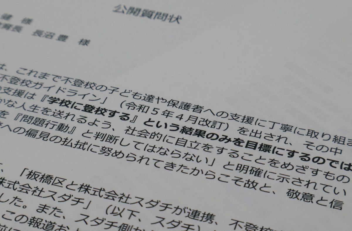 15日、不登校児童・生徒の保護者や支援者でつくる市民団体が連名で、板橋区長と教育長宛てに経緯をただす質問状を送った。