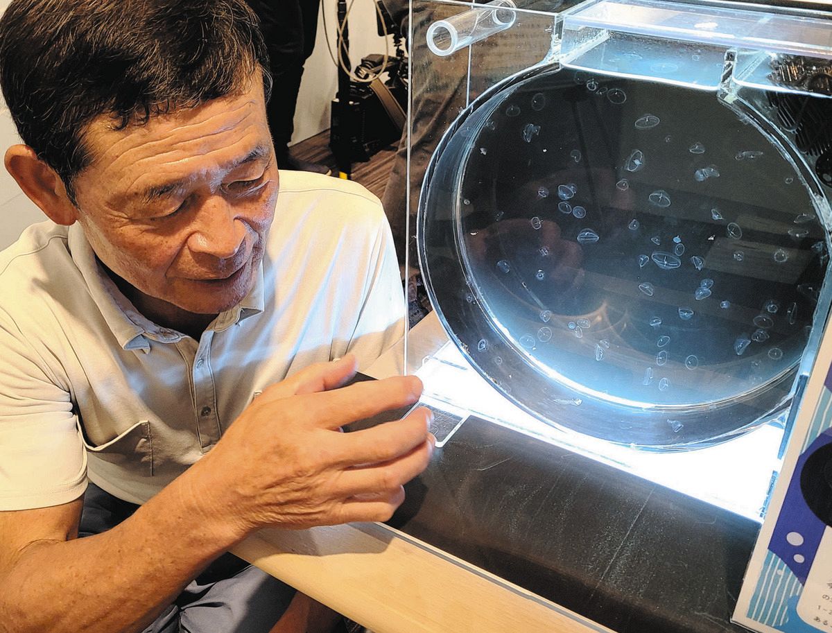 水槽に入れると小さな触手が見え、「クラゲだ」とピンときた。図鑑で調べても種類が分からず、クラゲ研究で知られる山形県鶴岡市の加茂水族館に協力を依頼。世界では長崎県で2例しか見つかっていないワタゲクラゲとわかった。