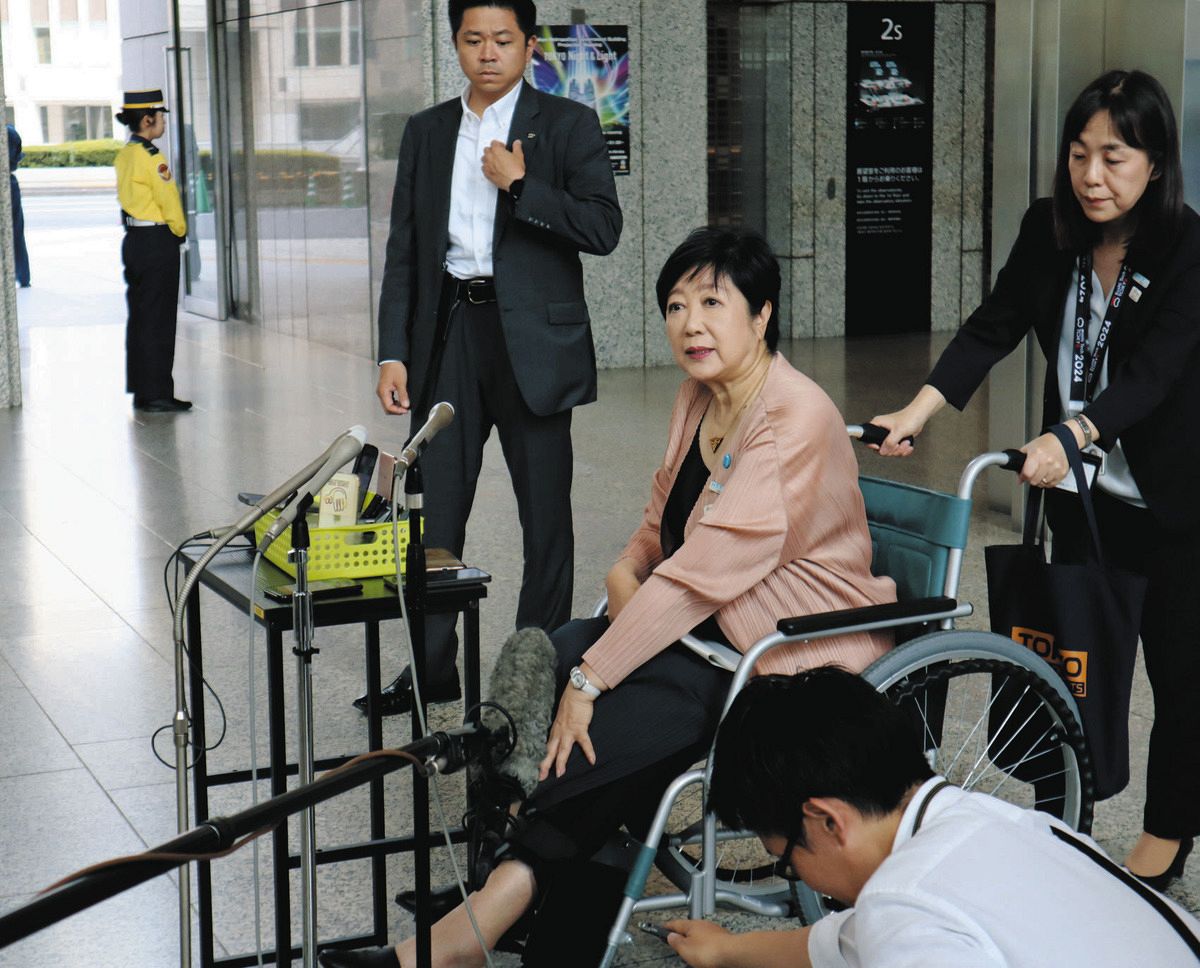 今月6日夜に神宮球場で行われたプロ野球の始球式で左膝関節を剝離骨折し、全治2カ月の診断を受け、テレワークで公務をしていた。南海トラフ地震臨時情報が発表された8日夜には、災害対策本部会議に自宅からオンライン参加。15日の都戦没者追悼式は車いすで出席した。