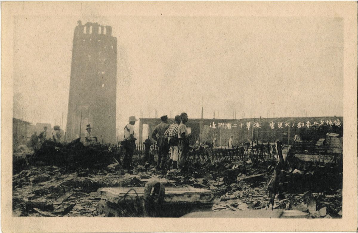 がれきだらけの街に立ち尽くす人々を伝える絵はがき=稲荷鬼王神社提供