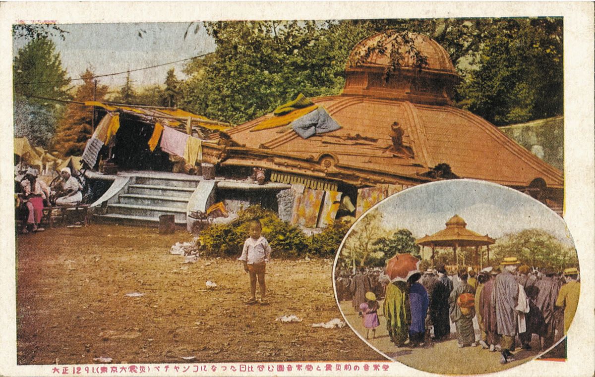 倒壊した日比谷公園の旧音楽堂の前で立ち尽くす子どもの様子を伝える絵はがき=稲荷鬼王神社提供