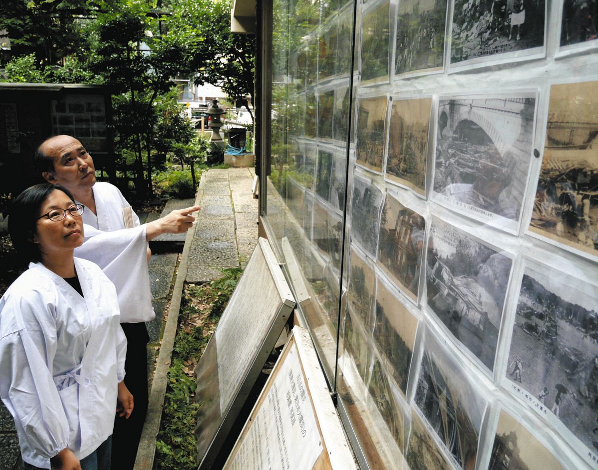 関東大震災の写真を見つめる大久保直倫宮司(右)と玲奈さん(中村真暁撮影)