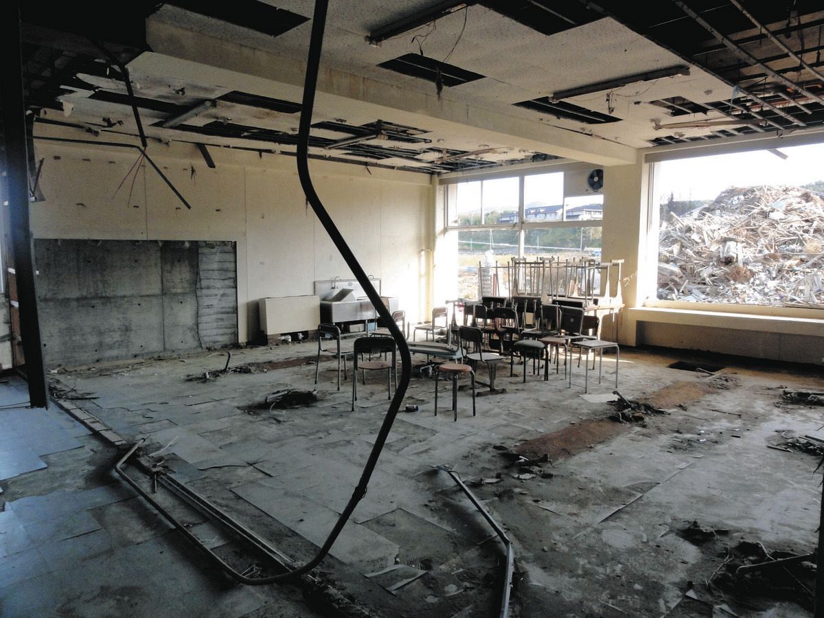 大久保直倫さんが撮影した、東日本大震災で天井が崩れ落ちた学校の教室=稲荷鬼王神社提供