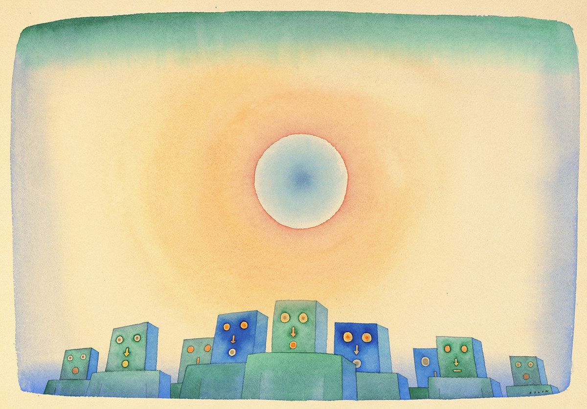 空には温かくやわらかな光を放つ大きな太陽。無表情だが、どことなくユーモラスな顔をしたロボットのような物体が、爽やかな色合いで水彩のぼかしを巧みに使って描かれる。主要な構成要素は丸と四角だけ、構図もとてもシンプルだ。はて、この群衆は一体なんだろう?