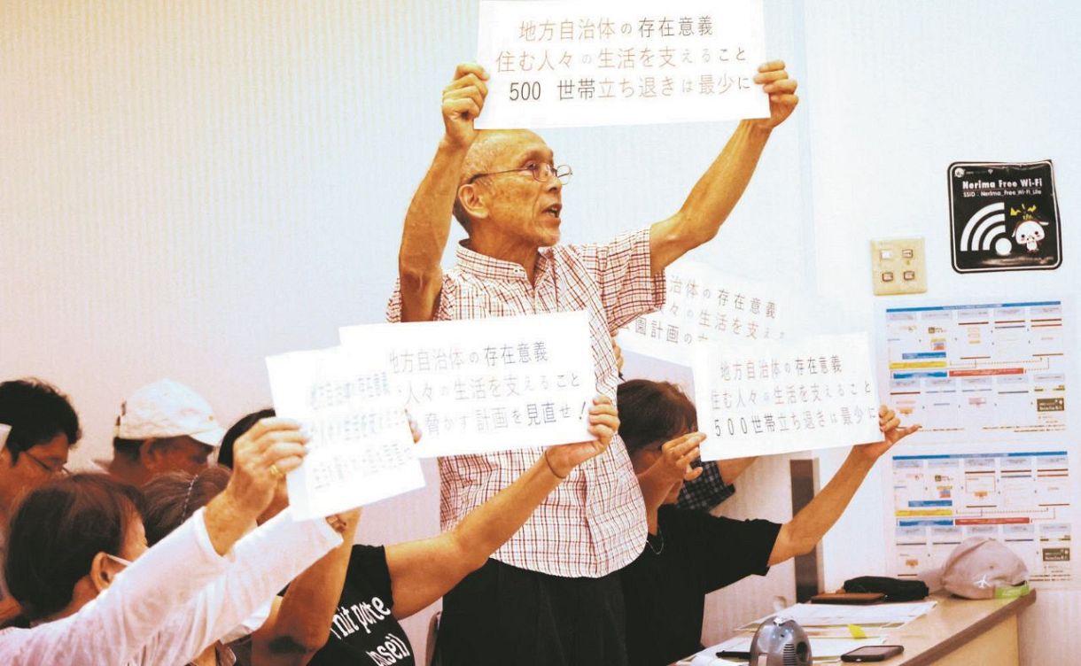 21日、練馬区役所で行われた会合の開始前、計画見直しを求める紙を掲げて抗議する住民