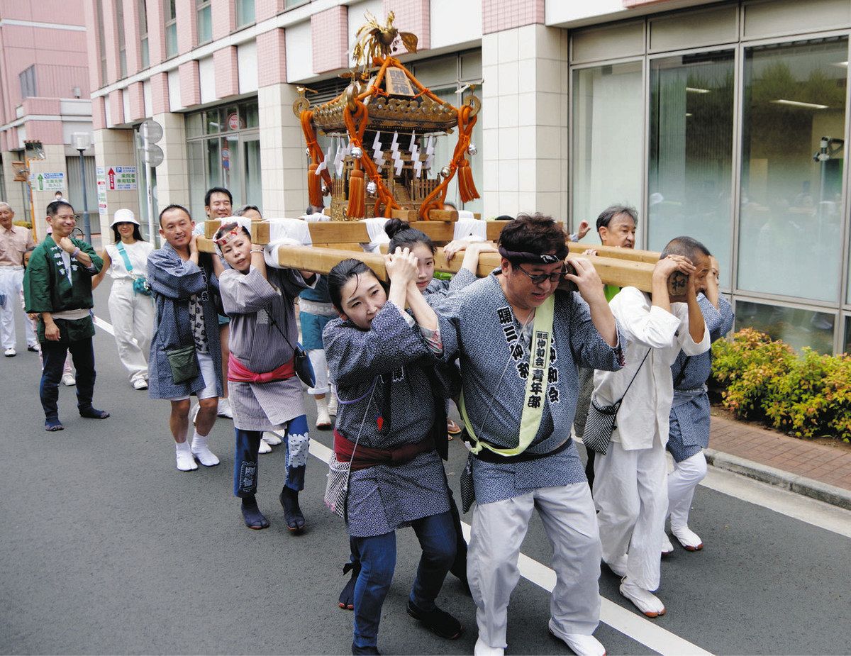 昨年の例大祭の様子。みこしを担ぐ参加者たち=東京都立川市で