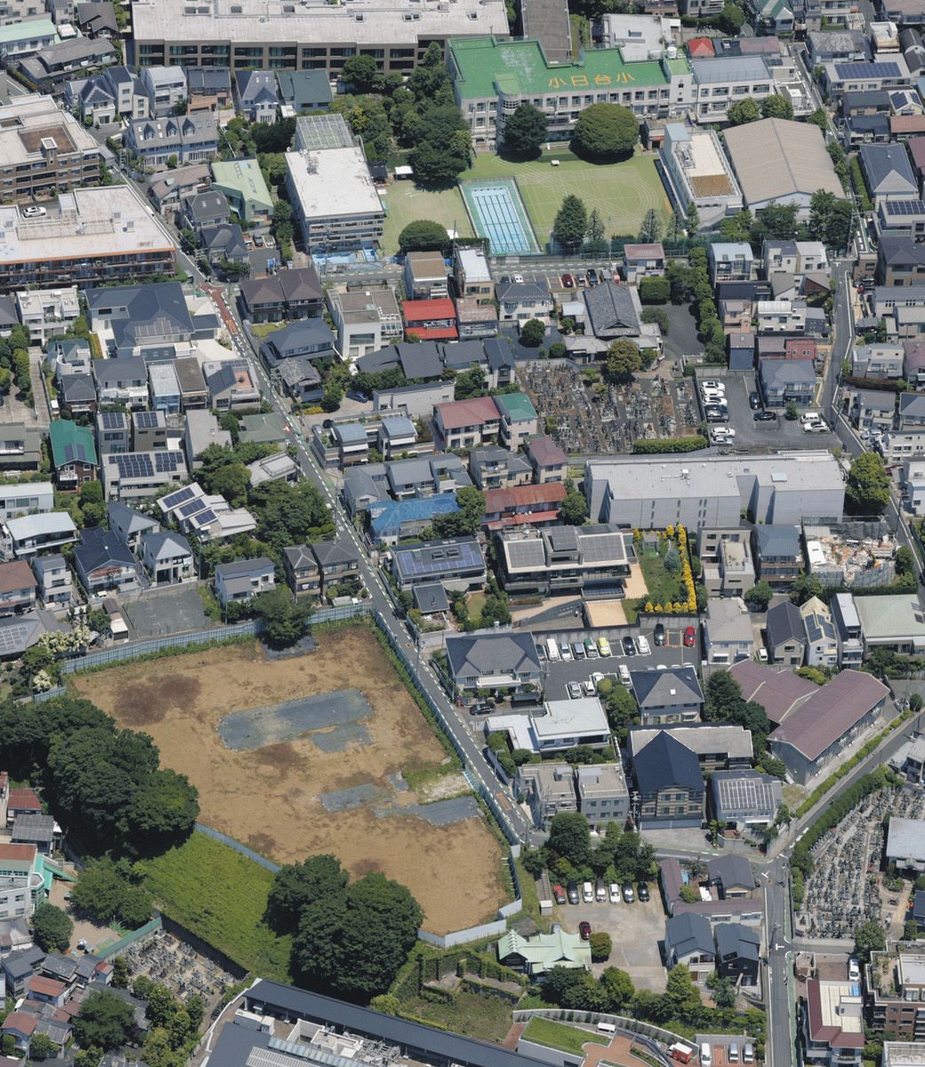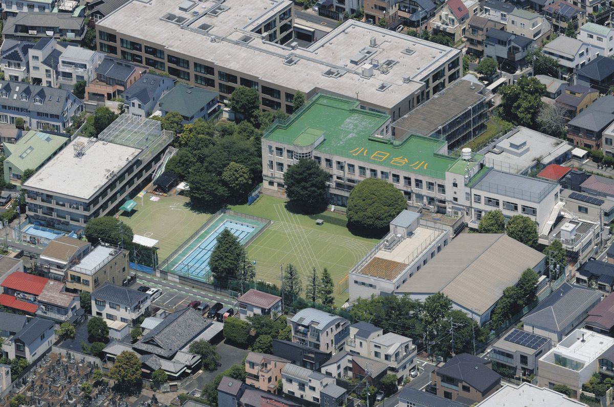 改築が計画されている小日向台町小。周辺の道路は幅が狭く、一方通行が多い=本社ヘリ「あさづる」より(川北真三撮影)