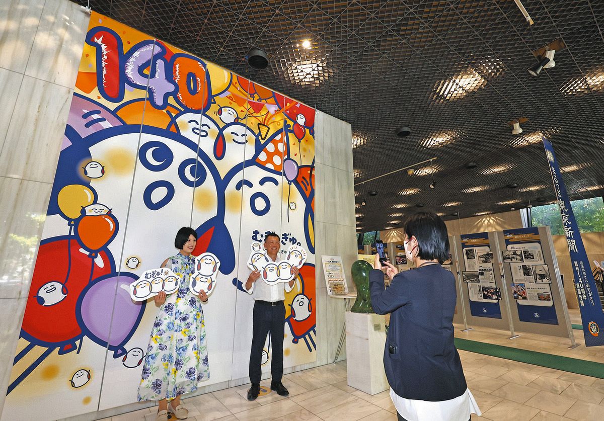 東京新聞が創刊140周年を記念して開く、読者参加の感謝イベント「まるっと東京新聞―読者の皆さんありがとう」が27日、東京都千代田区内幸町の東京新聞本社(中日新聞東京本社)で開幕する。9月25日まで。1階ロビーでは記念キャラクター「むぎゅ」による節目を祝う巨大な垂れ幕を掲げ、来場者を出迎える。