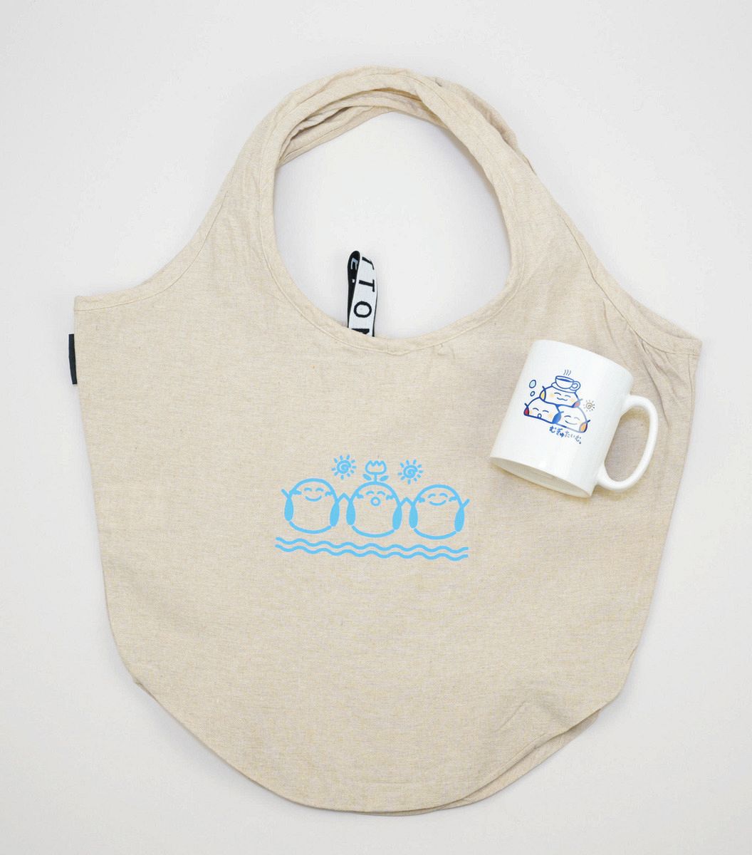 むぎゅのマグカップとマルシェバッグ=東京都千代田区の中日新聞東京本社で(木戸佑撮影)