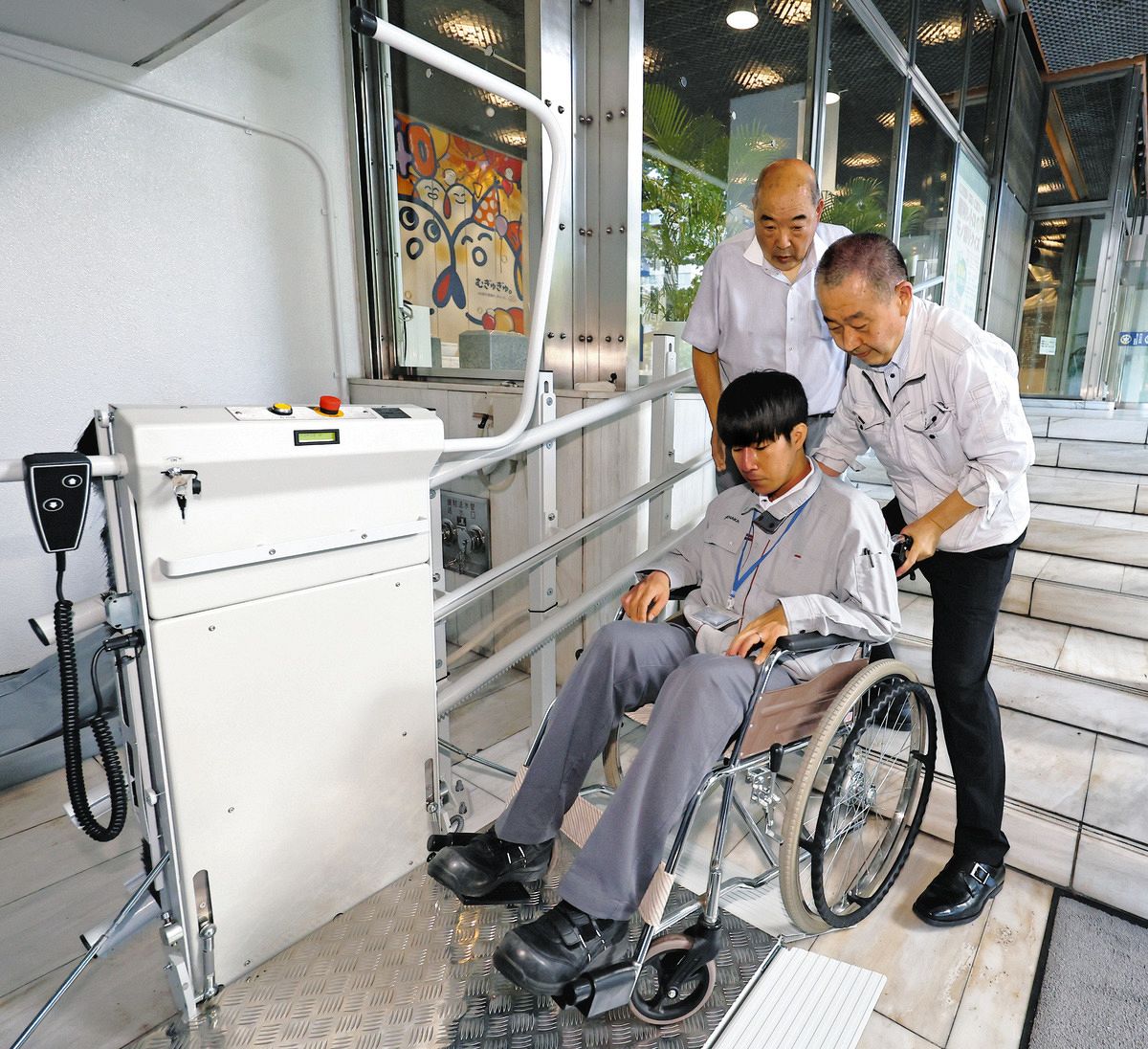 正面階段に設置された車いす用リフトの運用テストを行う関係者たち=東京都千代田区の中日新聞東京本社で(平野皓士朗撮影)