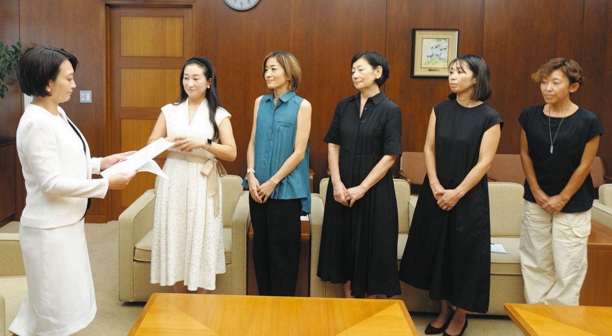 東京都港区の清家愛区長(左)に要請書を手渡した「明治神宮外苑を子どもたちの未来につなぐ有志の会」の人たち=28日、区役所で