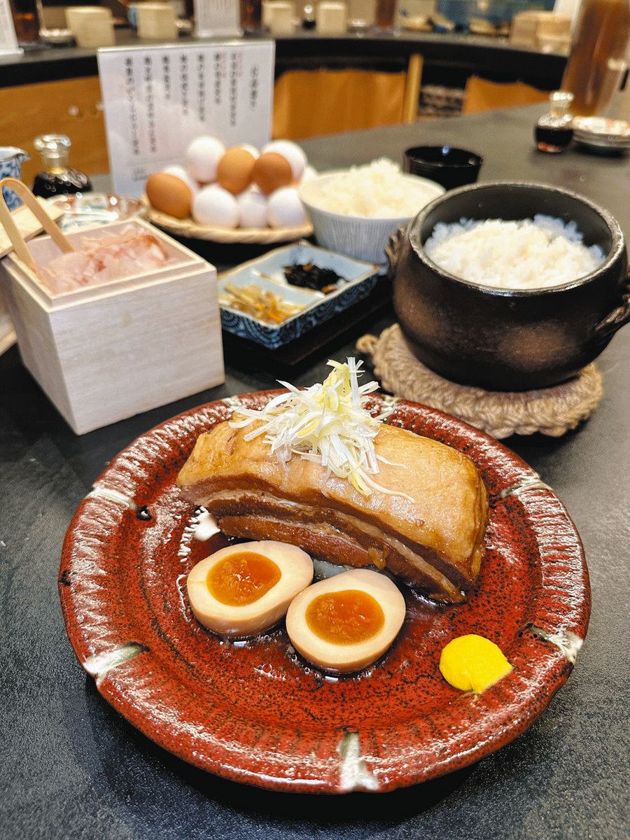 林さんの志の通り、平日は千円で提供している「鶏の竜田揚げ定食」もおいしいが、一番人気は「豚の角煮定食」(平日1600円)=写真(下)。分厚い角煮の存在感はインパクト十分。1人前250グラムもあり、かぶりつくとうま味がジュワッと口の中であふれる。「皆さん、平均してご飯は360グラム、卵は2個、かつお節は3グラムほど食べられます。いっぱい食べて喜んでもらいたいですね」(林代表)