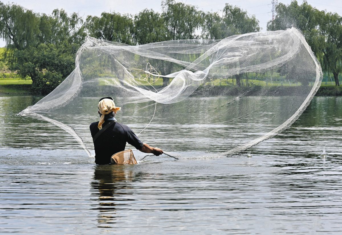 投網を使い、江戸川の魚を捕獲する参加者=葛飾区柴又で