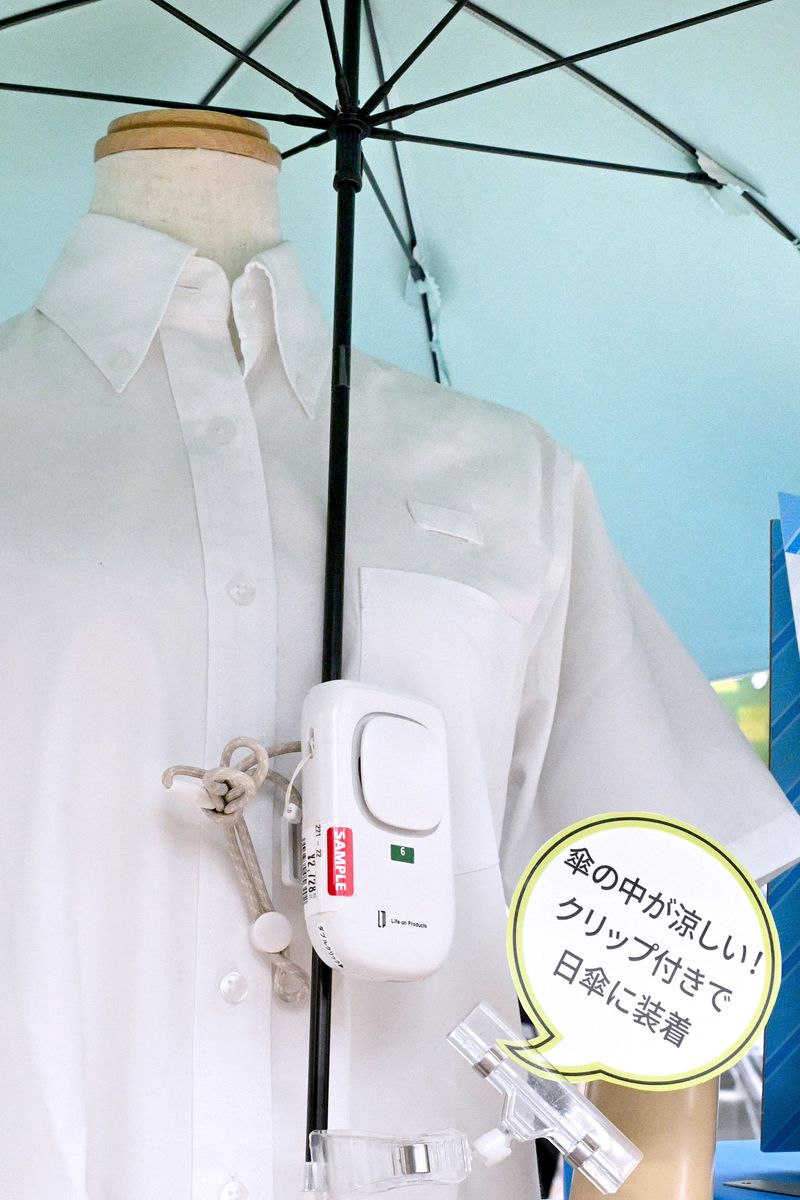 傘の中棒に付けられる携帯扇風機=東京都渋谷区のハンズ新宿店で