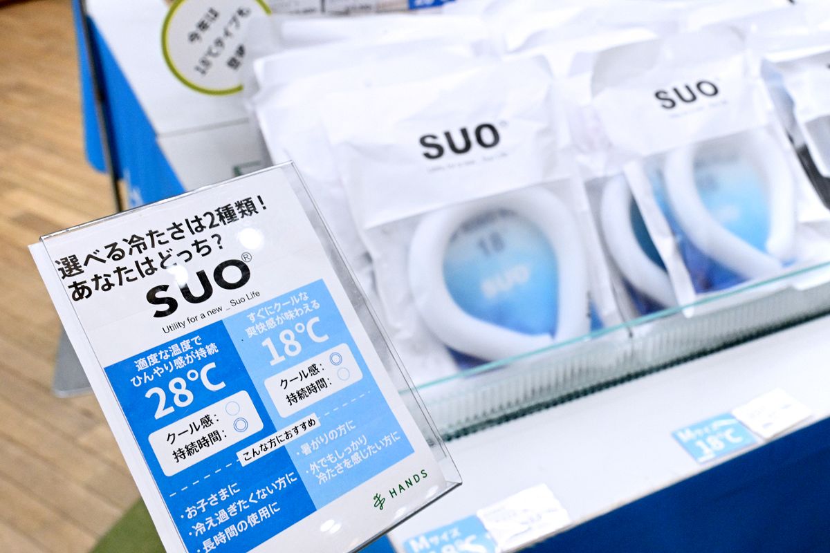 「ネッククーラー」は28℃で固まるものがこれからの行楽シーズンに長く活躍しそう=東京都渋谷区のハンズ新宿店で
