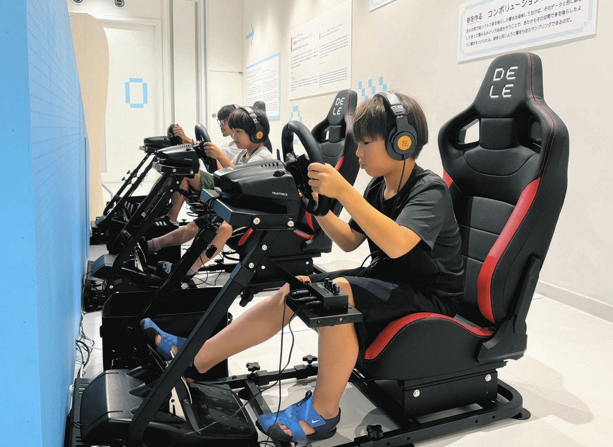 音を頼りに走行する「レーシングゲーム」を楽しむ子どもら=渋谷区で