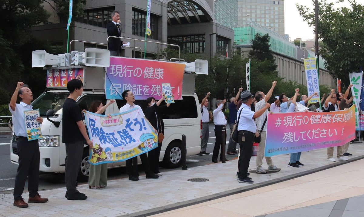 最後には、デジタル庁に向かって「マイナ保険証の押しつけ反対」「今まで通り保険証を残せ」「保険証廃止を撤回しろ」とシュプレヒコールを上げた。