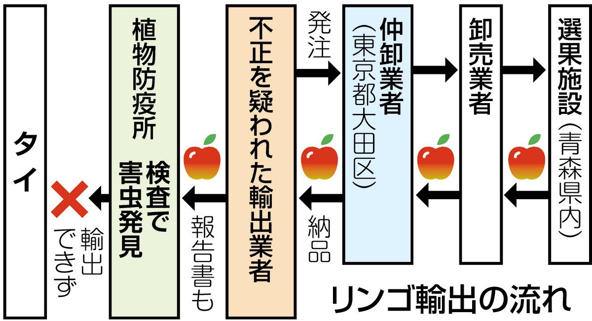 関係者によると、このリンゴには、タイに輸出する条件を満たしたものを選び梱包(こんぽう)したことを証明する青森県内の選果施設名義の報告書が付いていた。しかし、羽田空港内にある農林水産省植物防疫所の検査で、タイが国内に入れないようにしている害虫が見つかった。