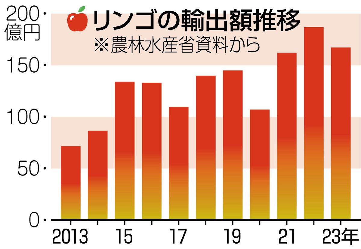 日本のリンゴは高品質を売りに、アジアで人気が広がっている。昨年の輸出額は約167億円で、10年前の2013年(約72億円)の2倍以上に。輸出先は首位の台湾(約111億円)が6割強を占め、タイは3位(約4億円)だ。