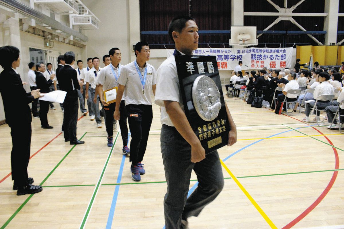 競技かるた部は、7月に滋賀県の近江神宮であった全国大会に出場。昨年に続いて団体戦を制し、個人戦でも共に3年の矢島聖蘭主将と小西美彩子さんが優勝を果たした。矢島主将は「苦しさに押しつぶされそうだった。経験は宝物になりました」とあいさつした。