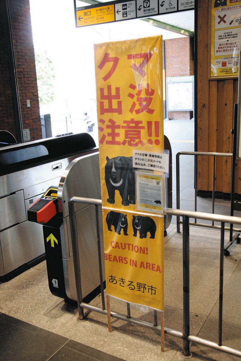 JR武蔵五日市駅の改札に立てられた「クマ出没注意‼」の看板=東京都あきる野市で