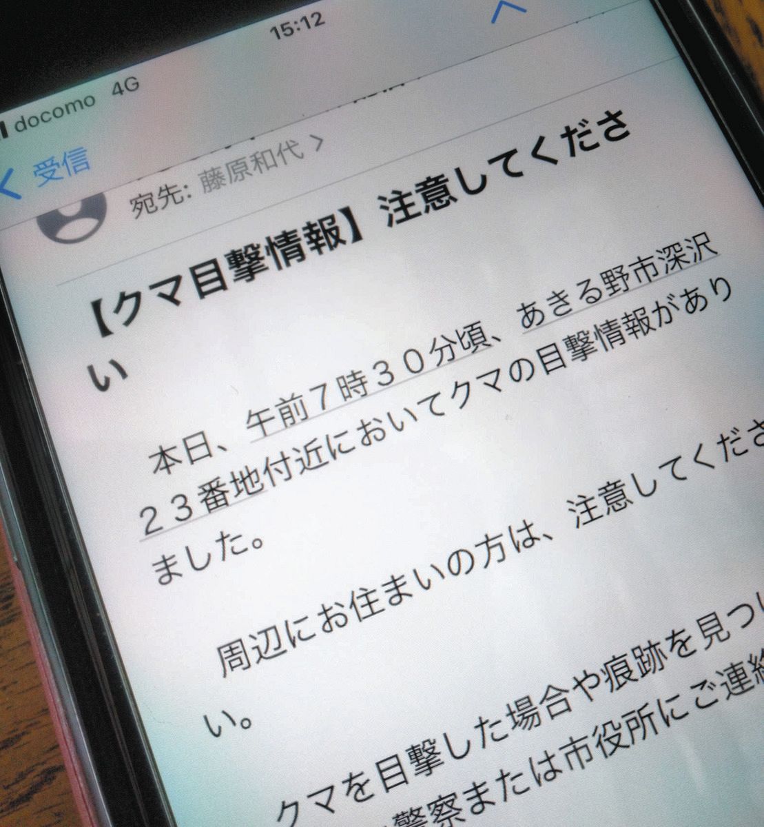 あきる野市から藤原和代さんにメールで送られたクマの目撃情報