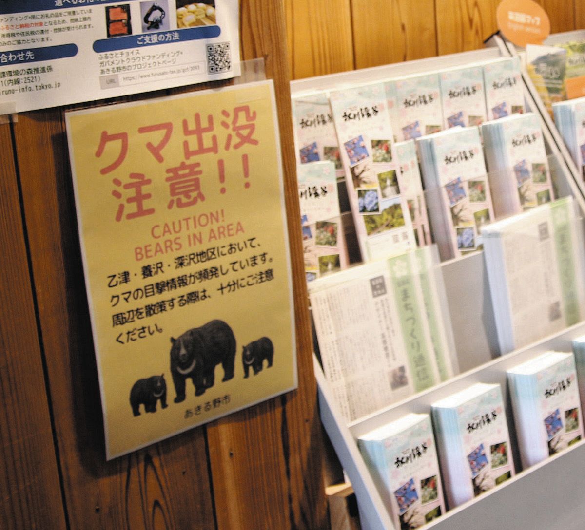 改札には「クマ出没注意!!」と書かれた立て看板があった。近くには渓谷や格好のハイキング道がある。そのガイドが書かれたパンフレット置き場や観光案内所、バス停など、駅や周辺の至る所に注意を促すポスターが張られていた。